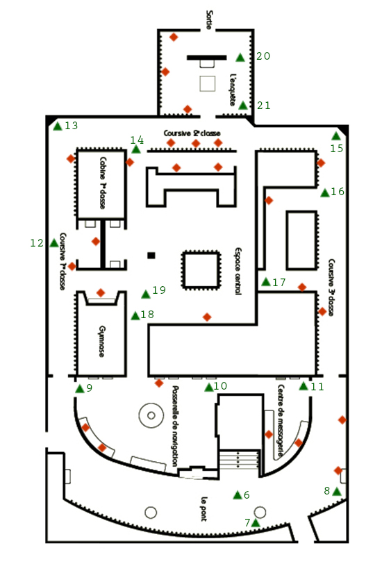 Une quatrième personne avait en charge la captation vidéo de la classe dans sa visite. Afin que cette celle-ci soit la plus efficace possible, un travail préparatoire de repérage a été effectué pour déterminer les positionnements de caméra et le scénario de visite des élèves. Ce repérage en collaboration avec Violaine BAVENT, étudiante dans la même formation et dont son questionnement repose sur l’utilisation de la vidéo dans la médiation culturelle, est constitué des plans indiquant le positionnement de la caméra et des photographies ci-dessous.