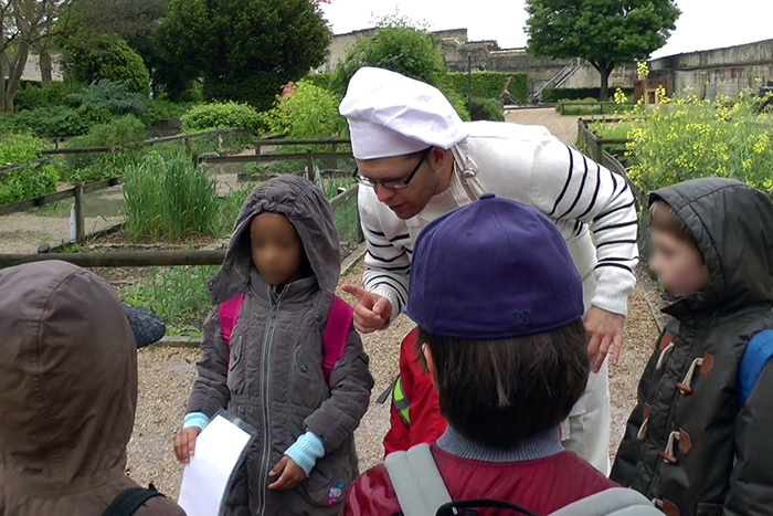 Les élèves des trois classes participant à cette découverte du château y venaient pour présenter dans la salle de l’échiquier des saynètes théâtrales l’après-midi même préparées en classe dans le cadre du projet Théa. Au cours de la matinée, 45 minutes de répétition étaient programmées pour chaque classe à des heures précises. La contrainte horaire était donc un facteur supplémentaire à prendre en compte dans la conception et l’organisation de cette médiation.